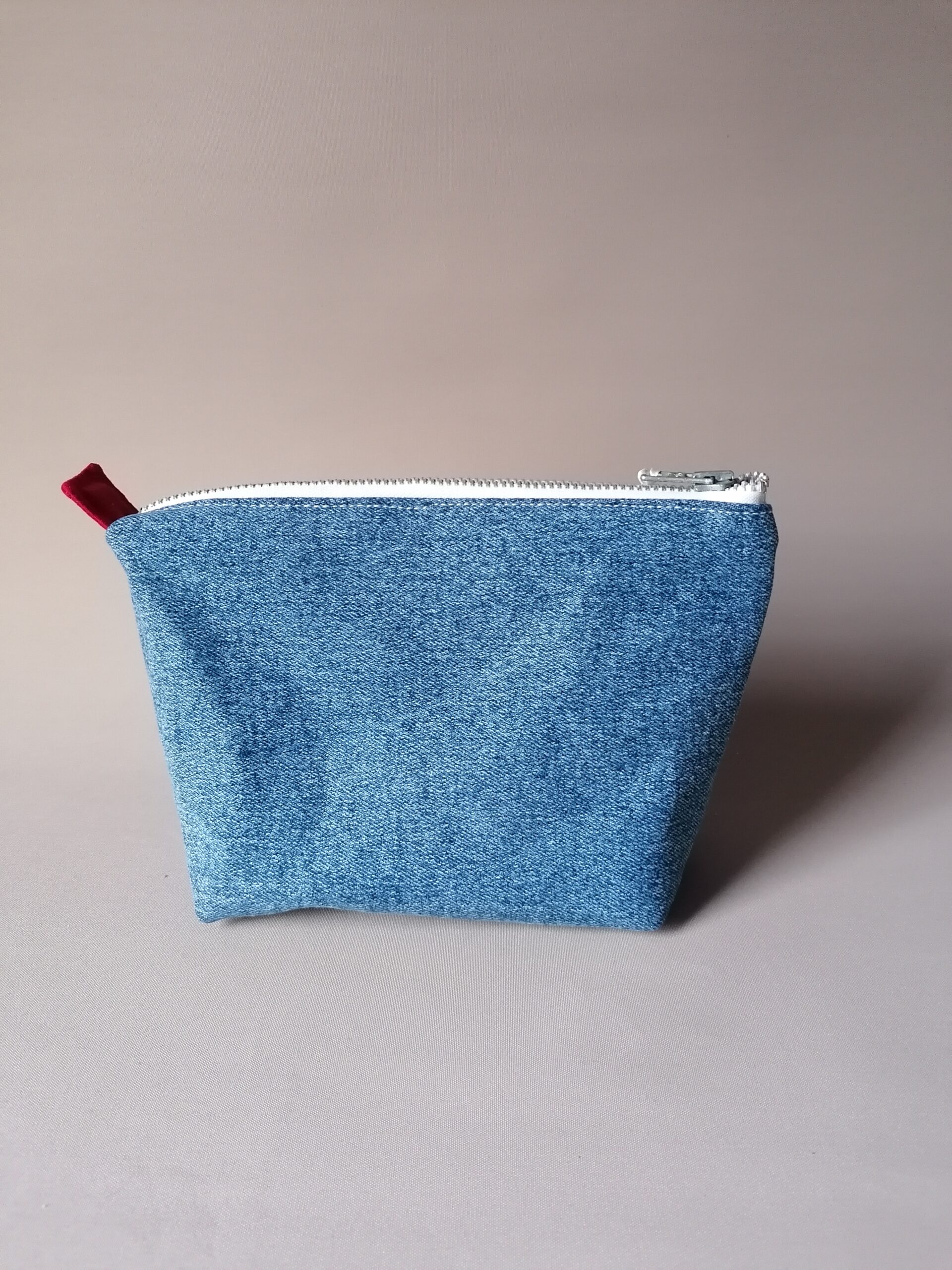 Trousse en jean upcyclé, avec appliqué cœur. Très pratique pour ranger tous vos accessoires personnels. Trousse lavable et réutilisable à volonté.